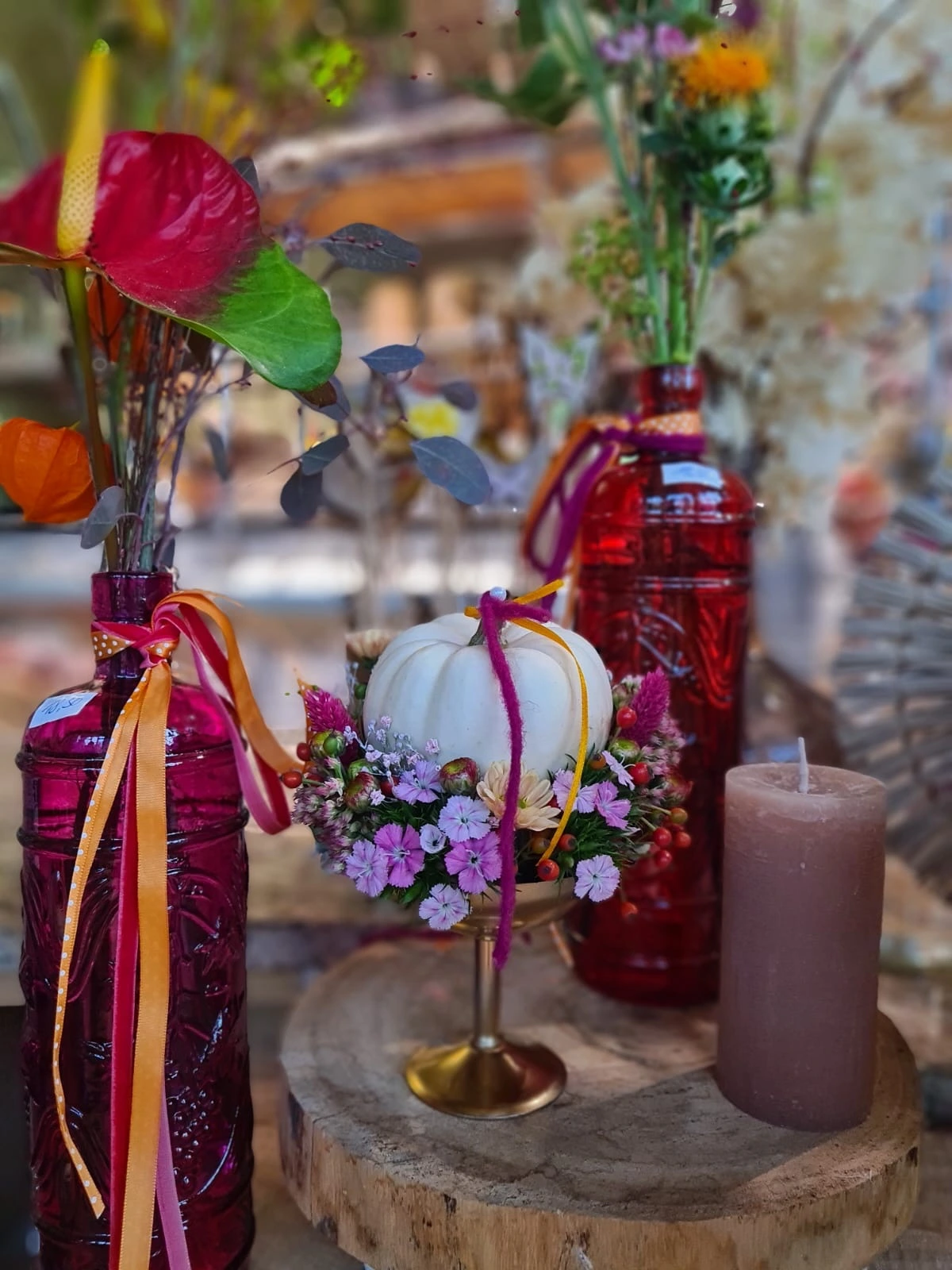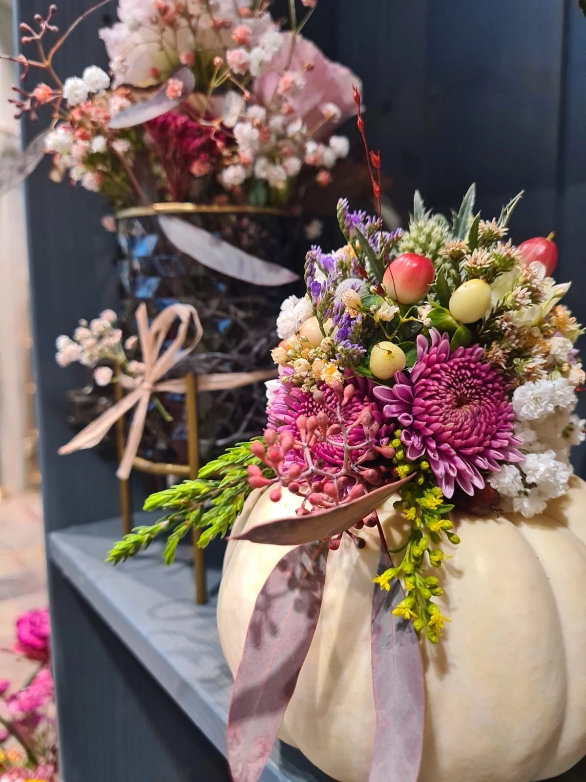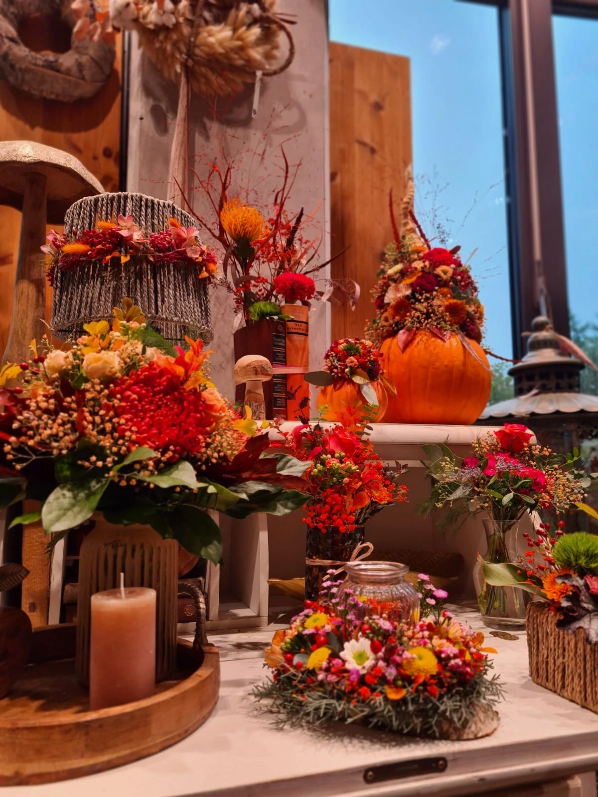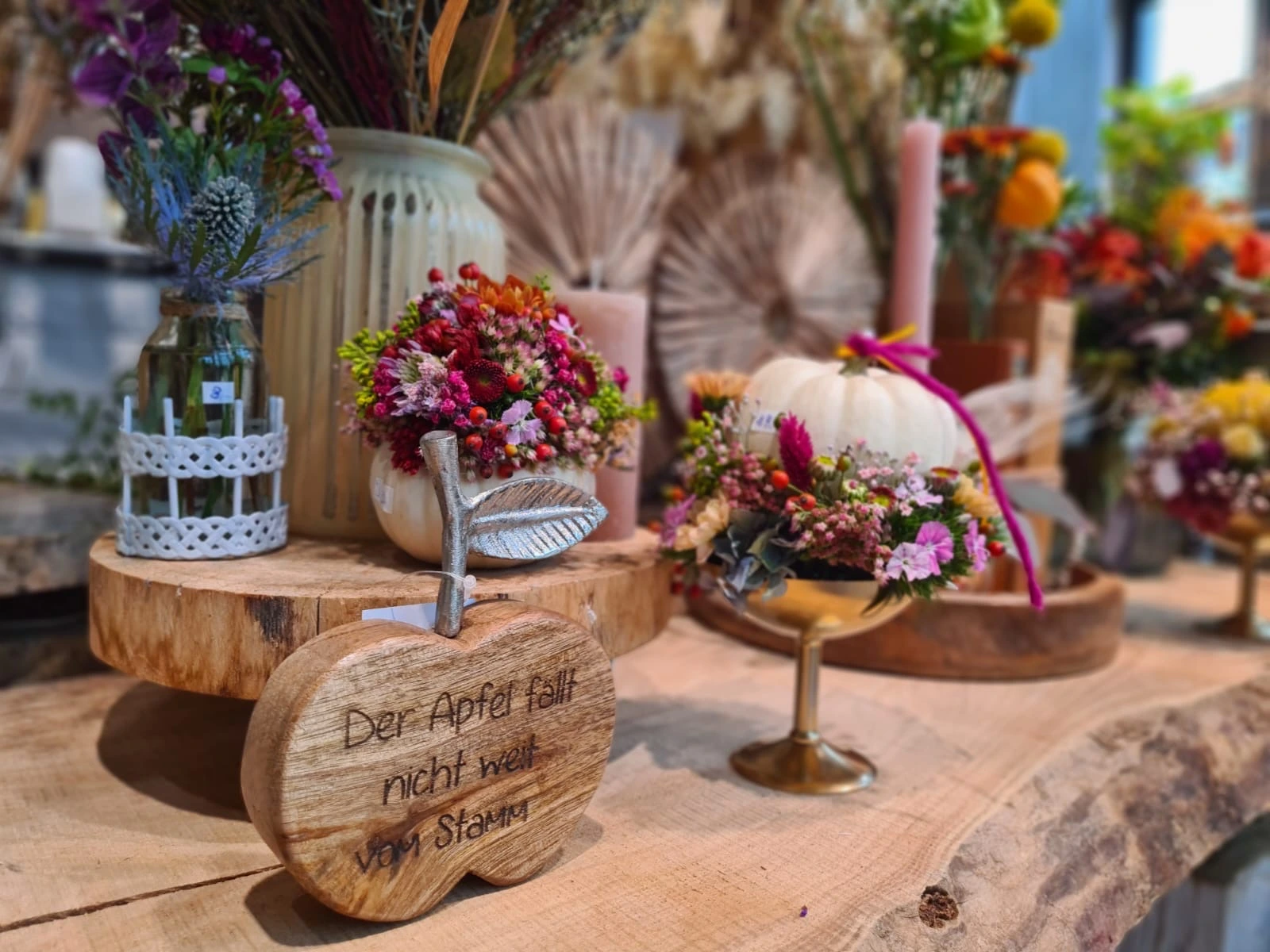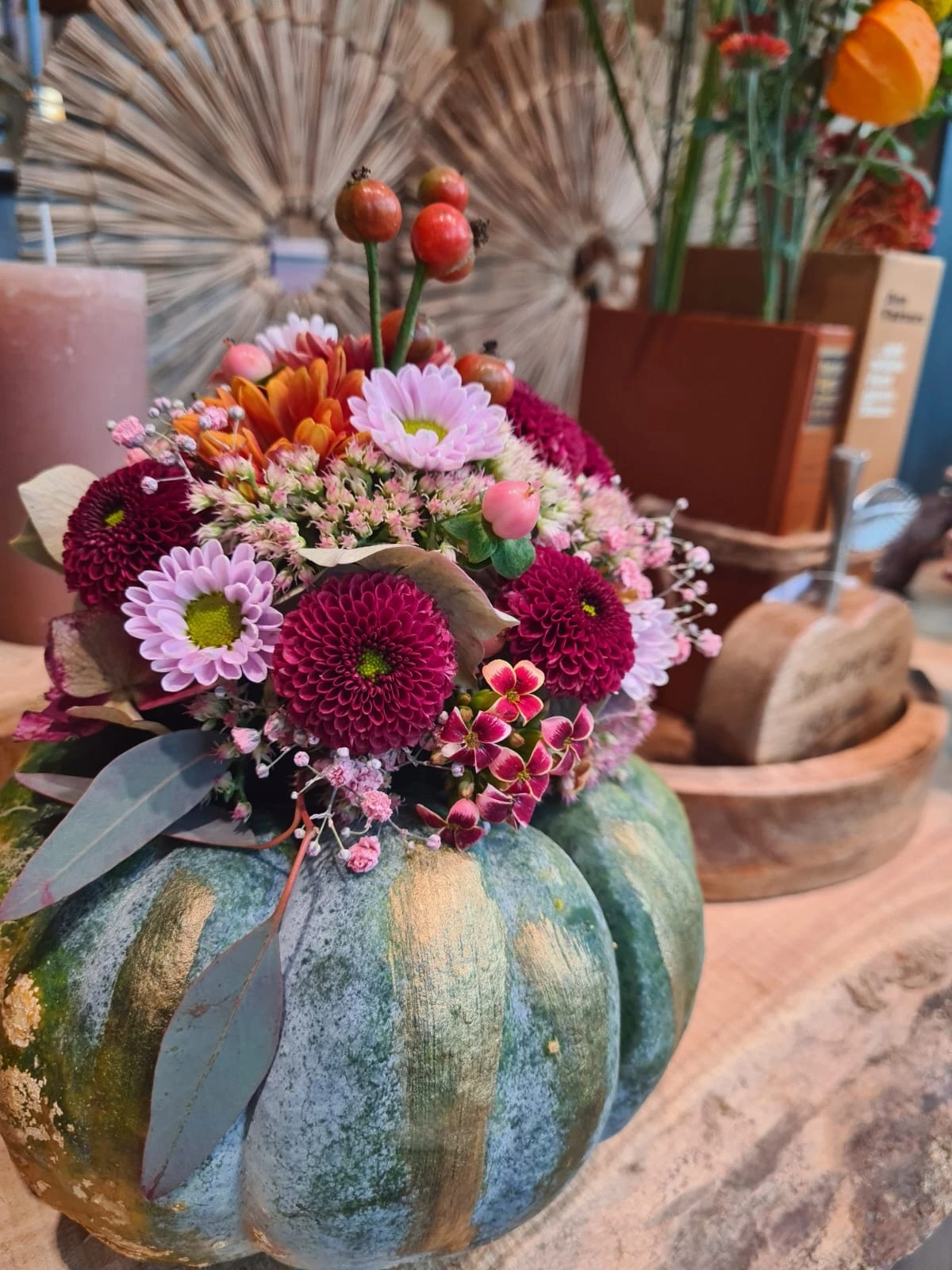 Unsere Floristen beraten Sie gerne und kreieren maßgeschneiderte Blumenkunstwerke für Ihre Herbstmomente.