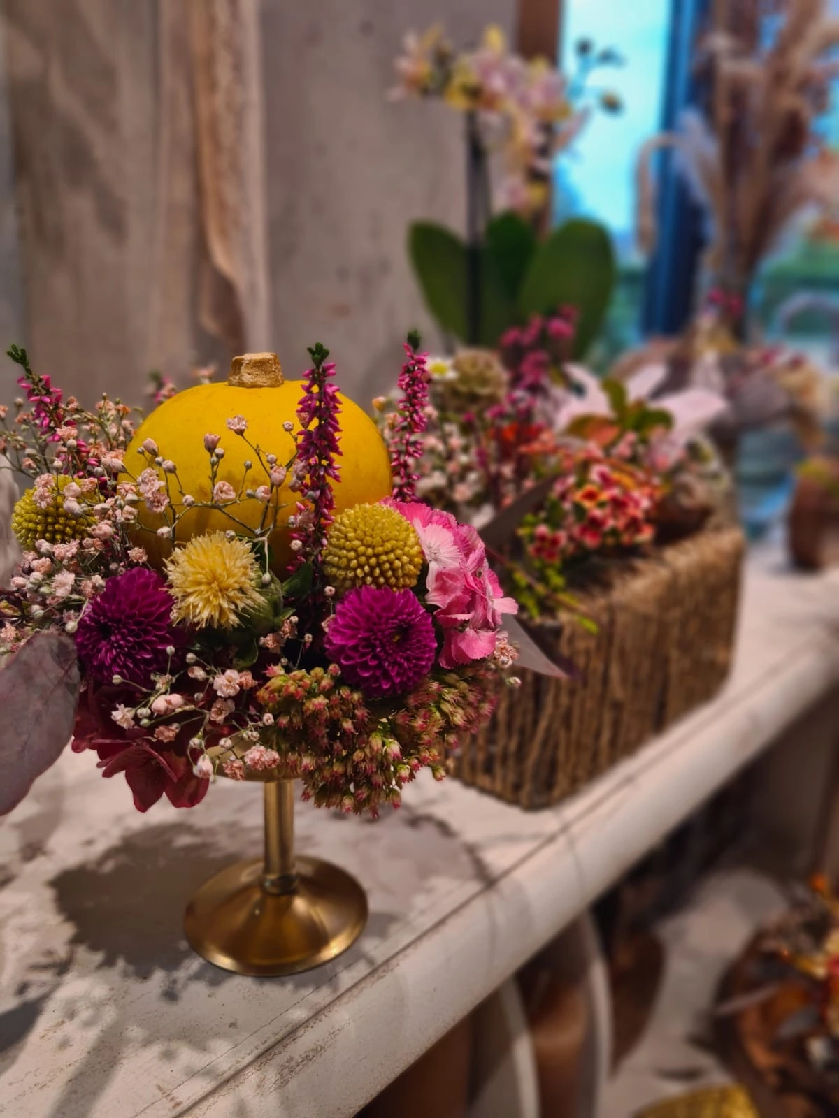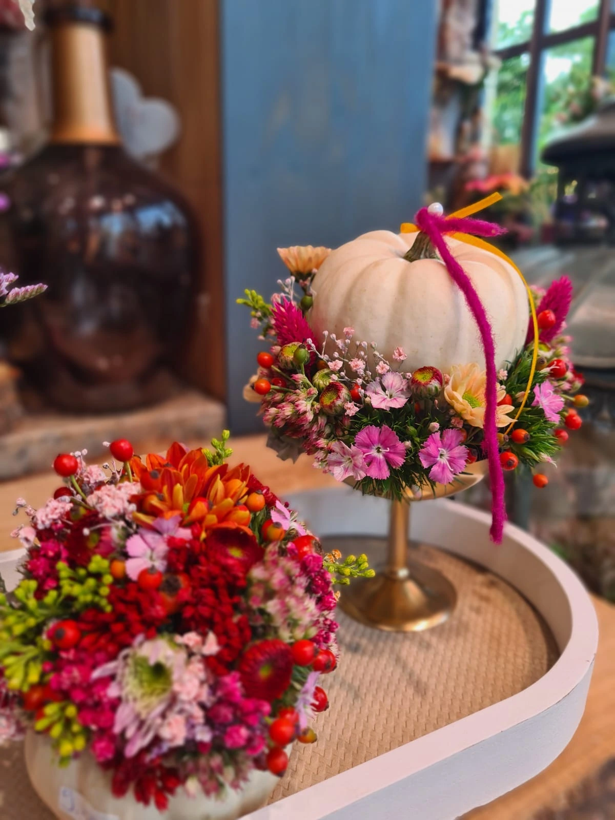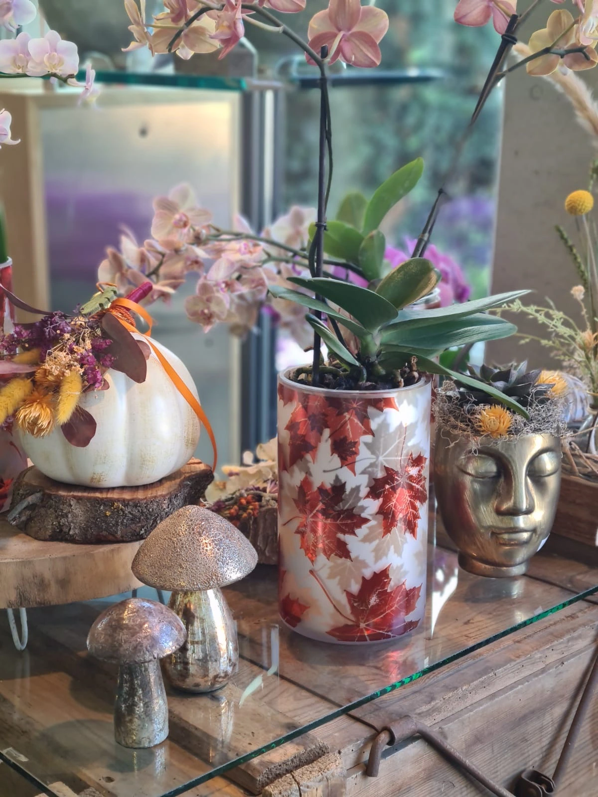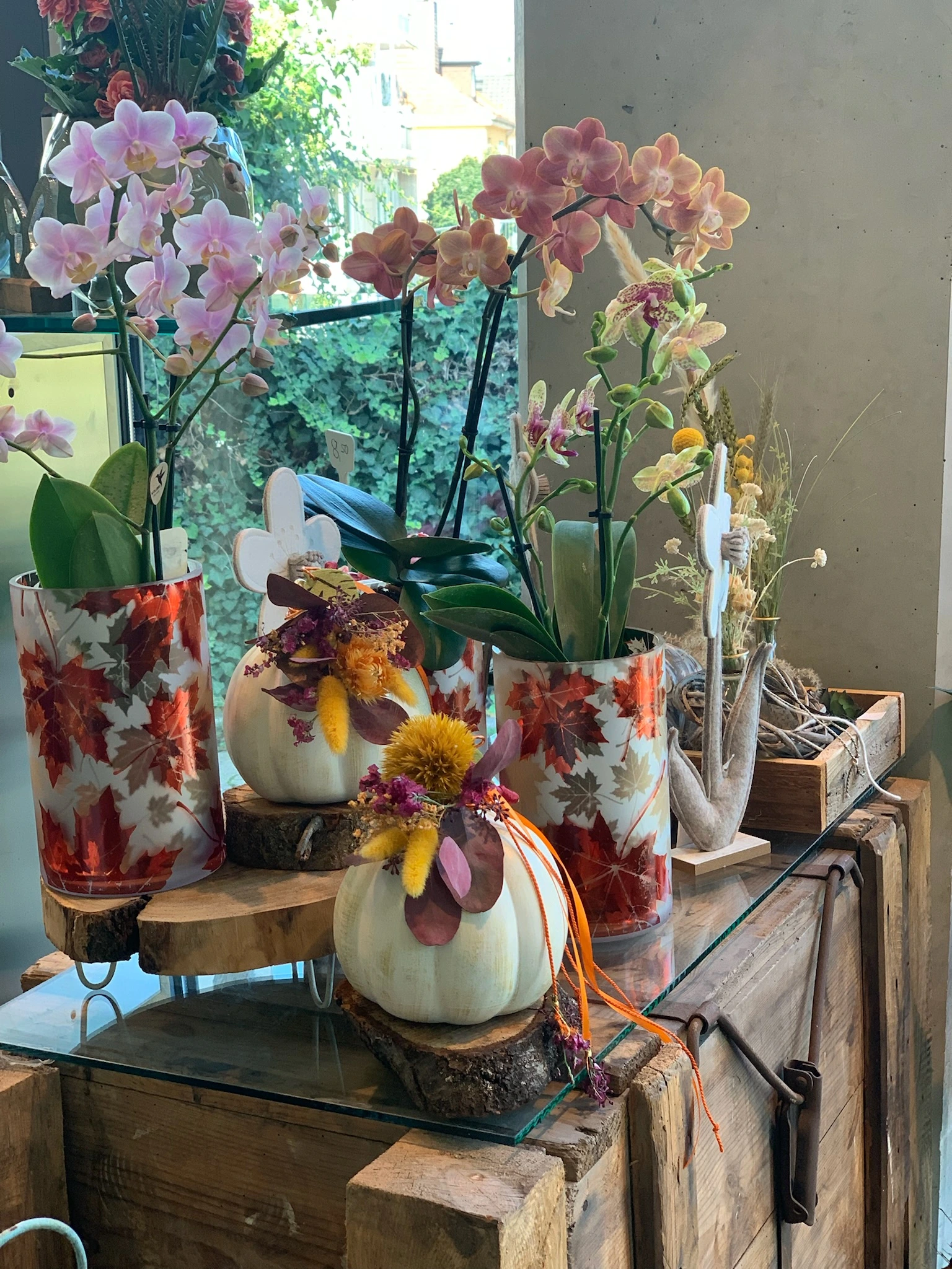 Unsere Floristen beraten Sie gerne und kreieren maßgeschneiderte Blumenkunstwerke für Ihre Herbstmomente.