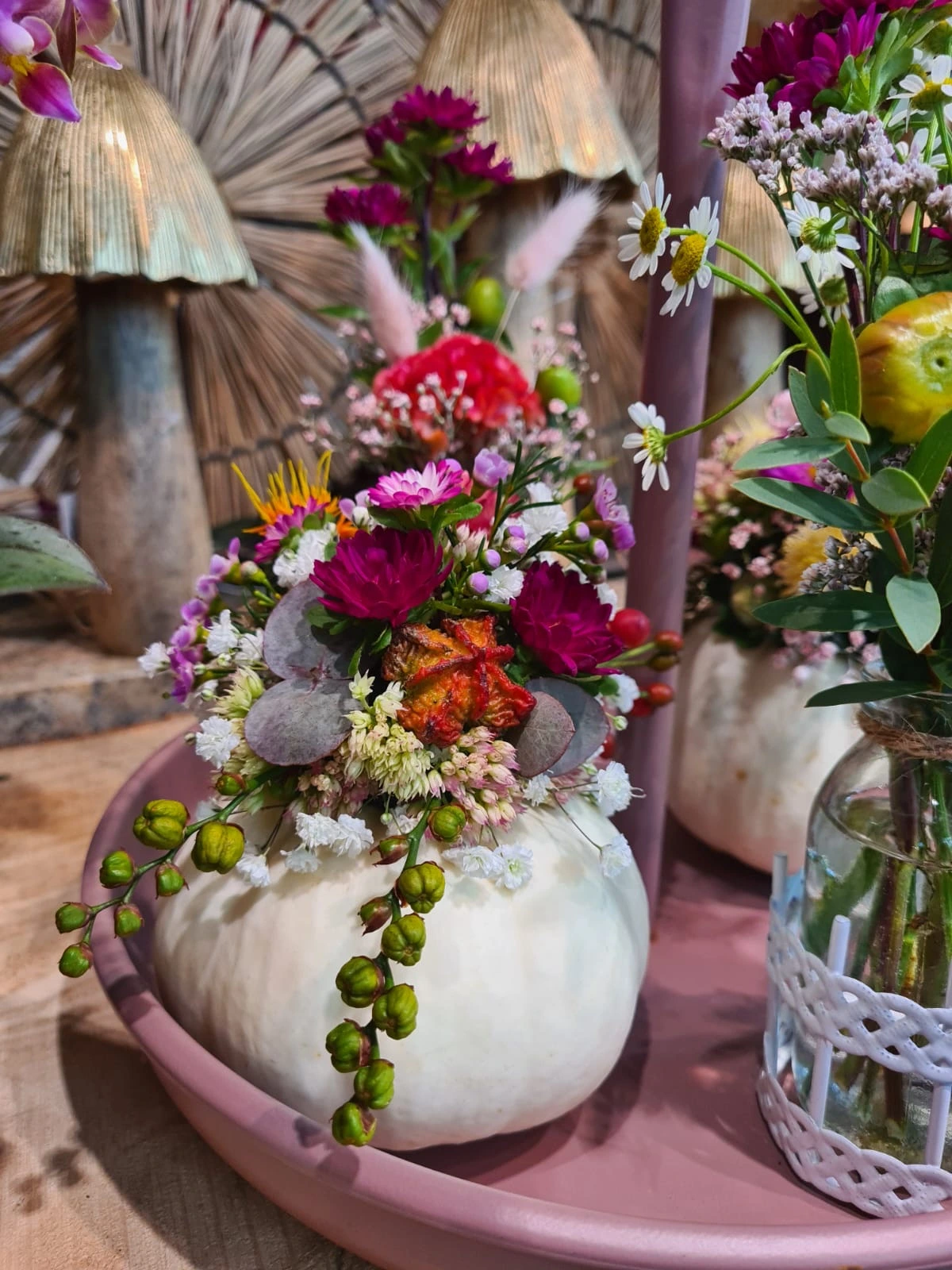 Ob klassische Herbstfarben, moderne Trockenblumenarrangements oder kreative Kürbisdekorationen – wir setzen Ihre Wünsche mit Liebe zum Detail um. Lassen Sie sich von der Schönheit der Jahreszeit inspirieren und verleihen Sie Ihren Räumen einen besonderen herbstlichen Charme.