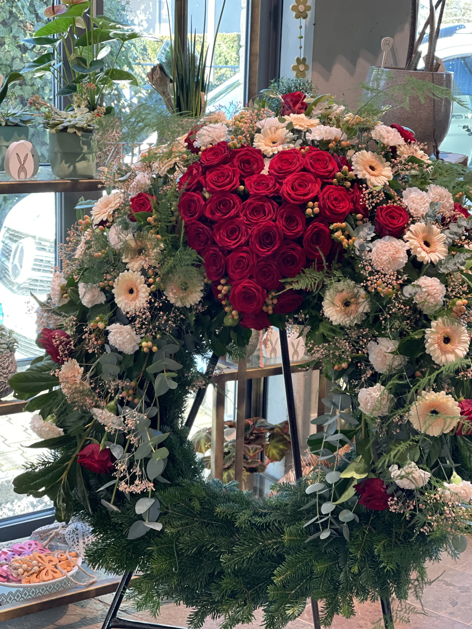 Ja, wir gestalten Trauerkränze nach Ihren Wünschen – mit bestimmten Blumen, Farben und individuellen Schleifenbeschriftungen.