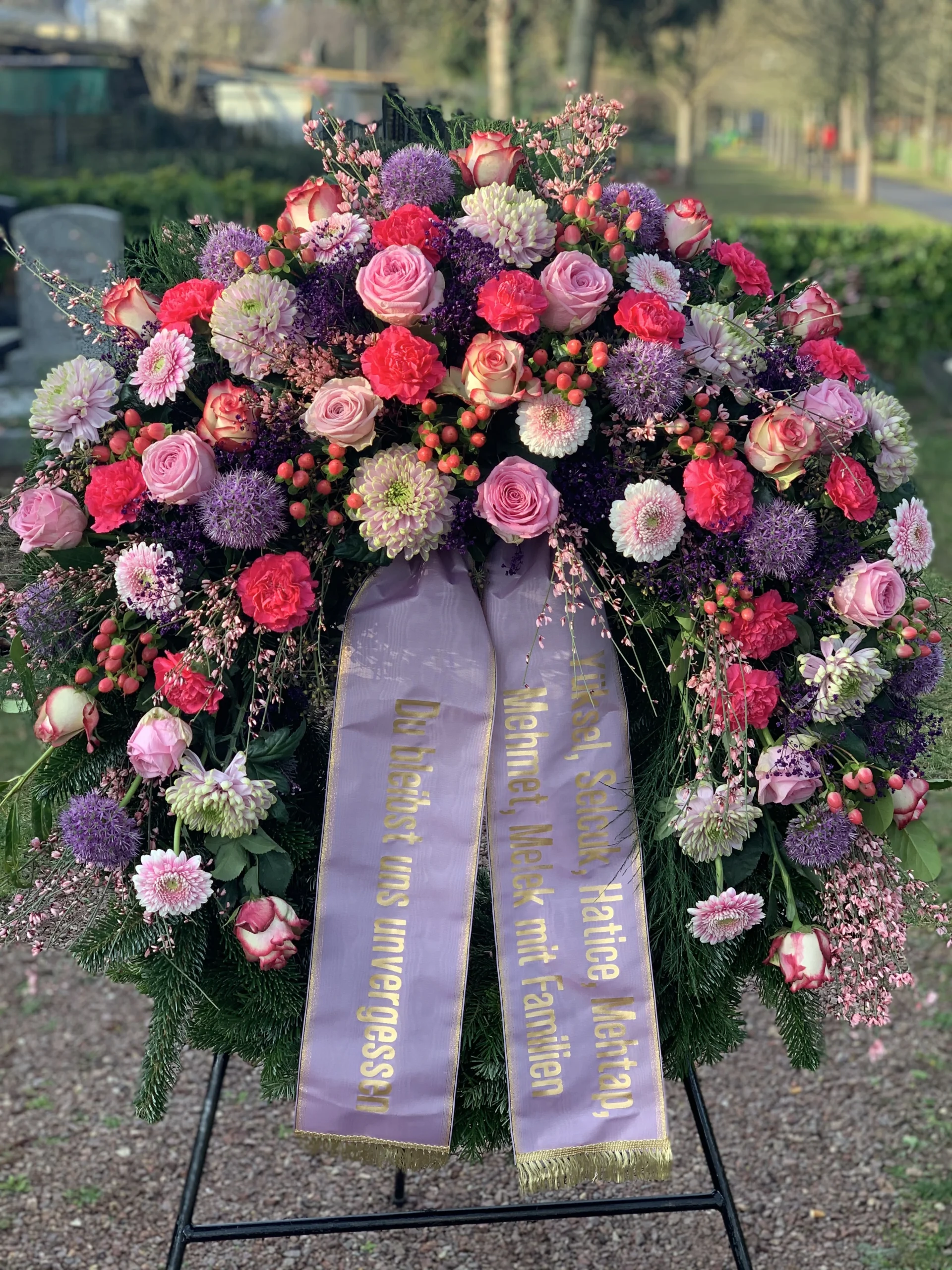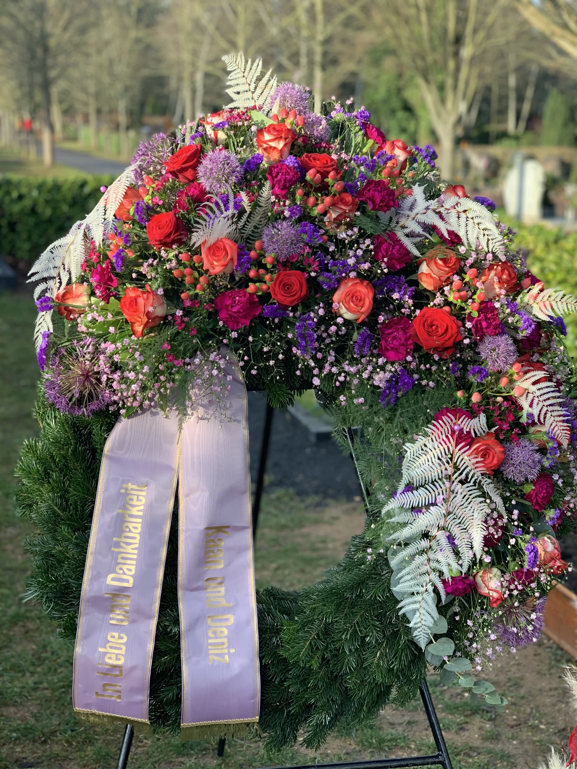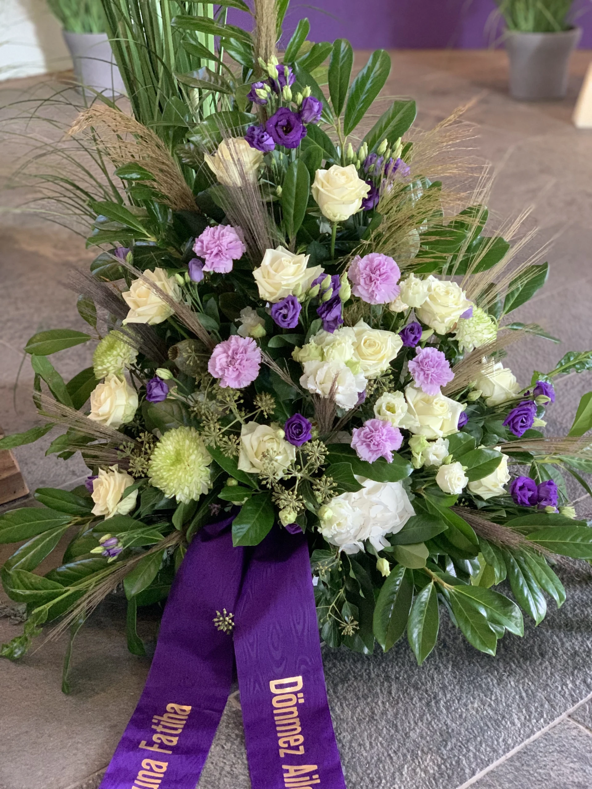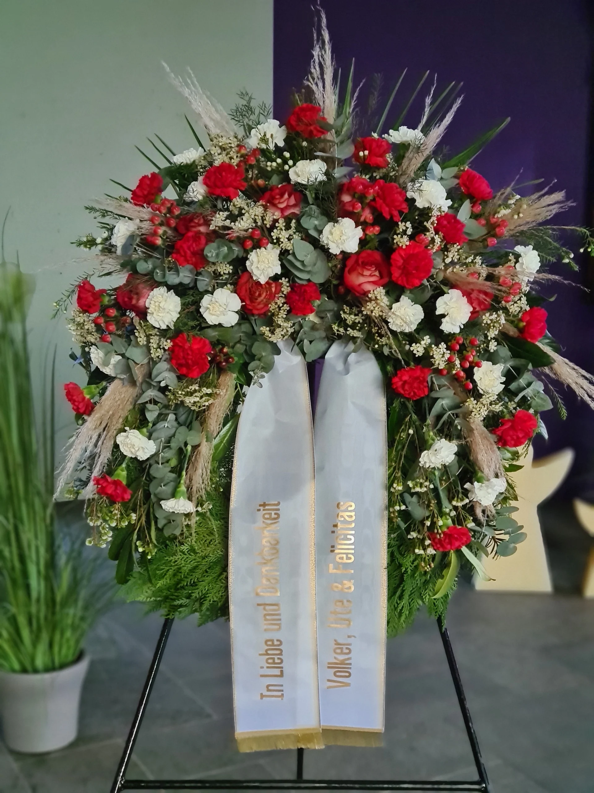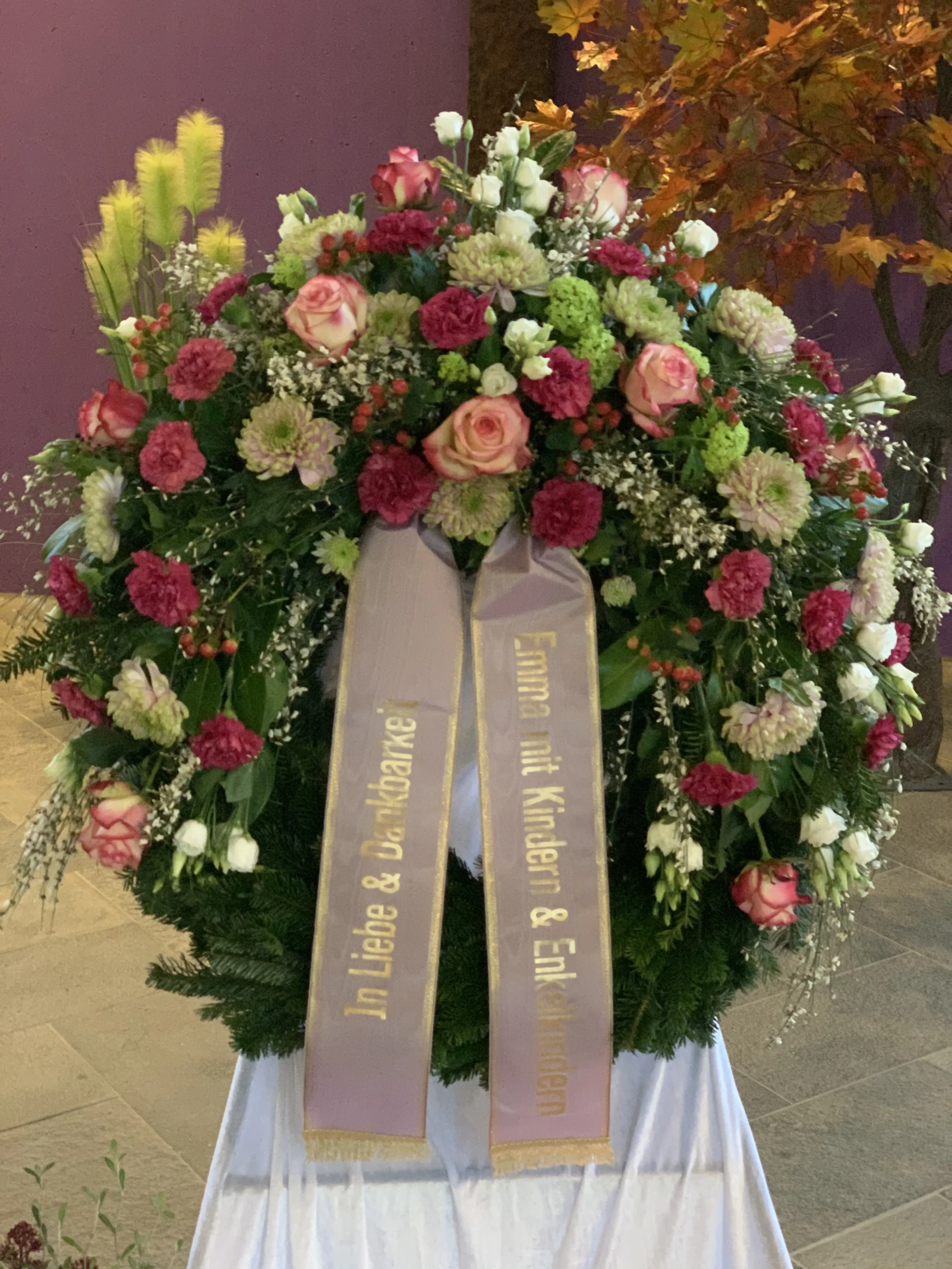 Ja, wir gestalten Trauerkränze nach Ihren Wünschen – mit bestimmten Blumen, Farben und individuellen Schleifenbeschriftungen.
