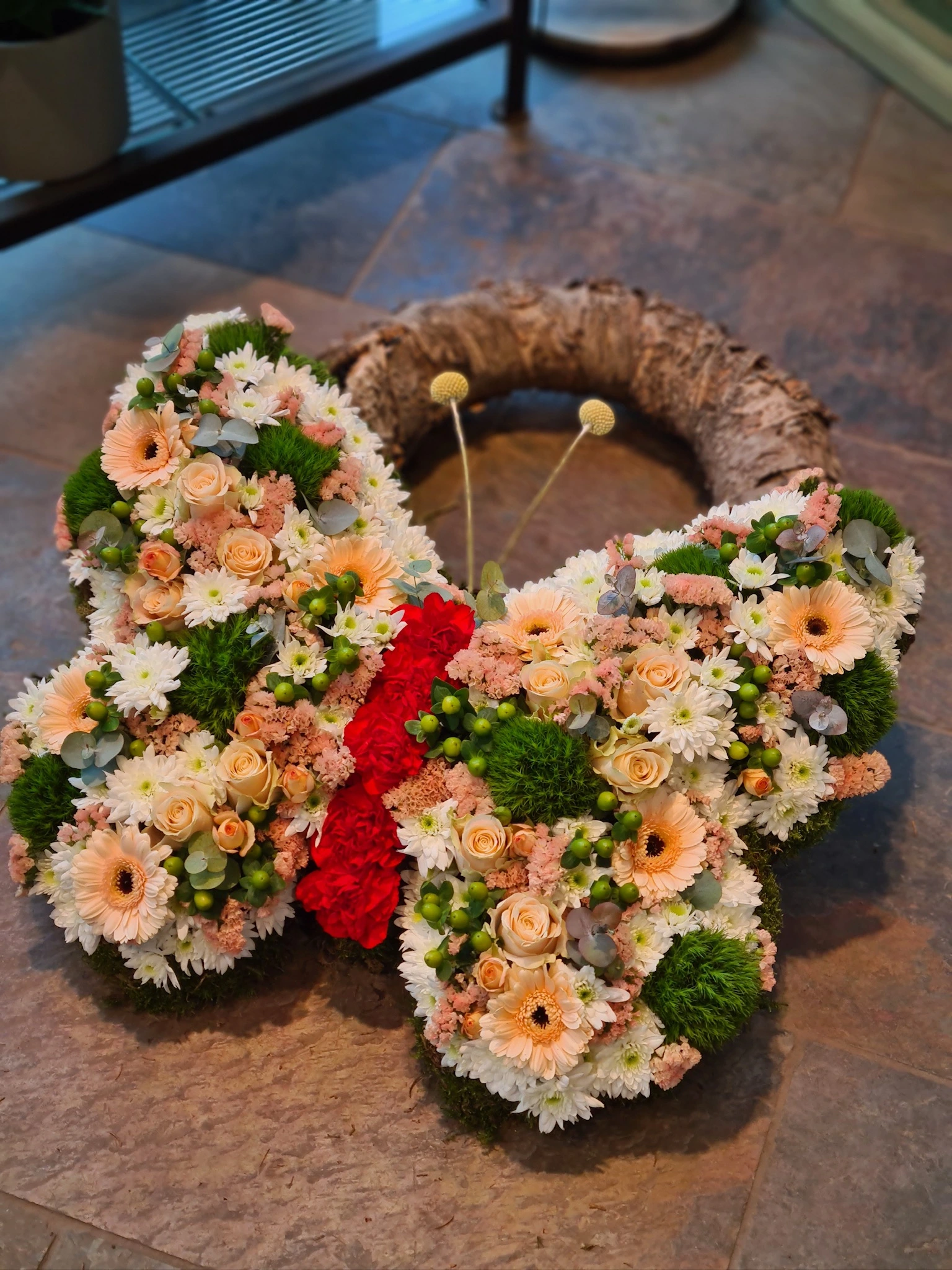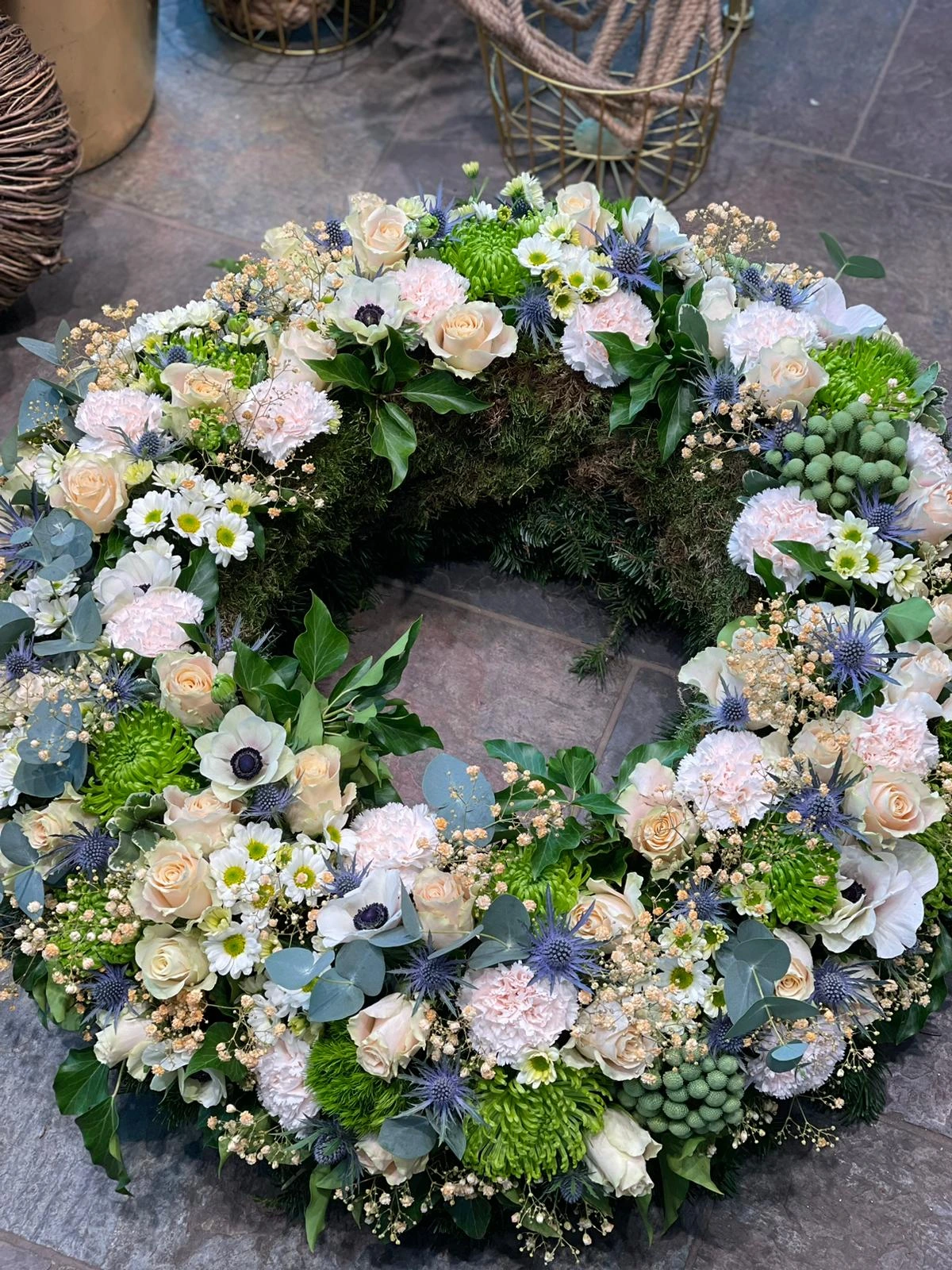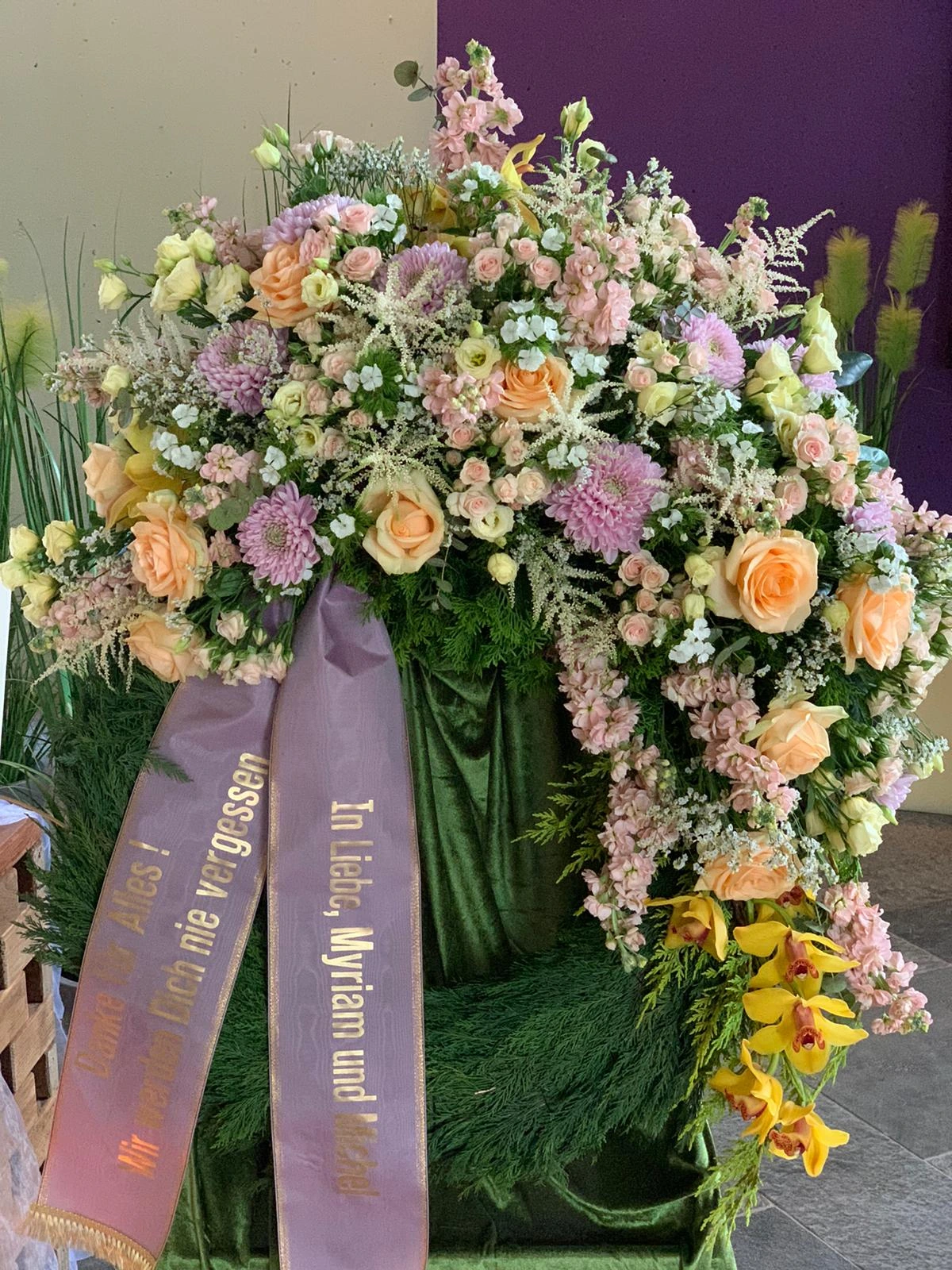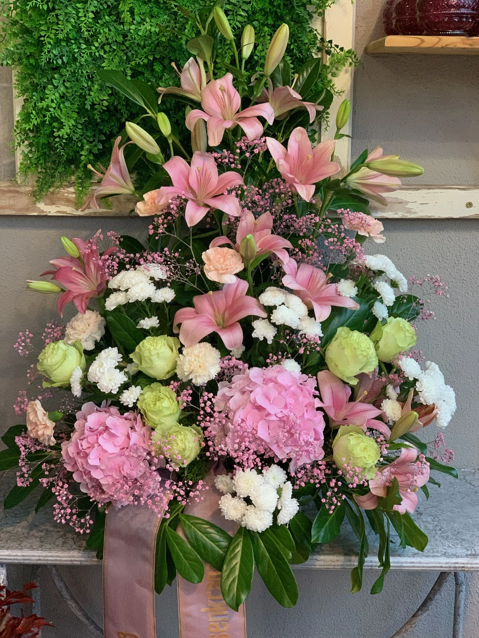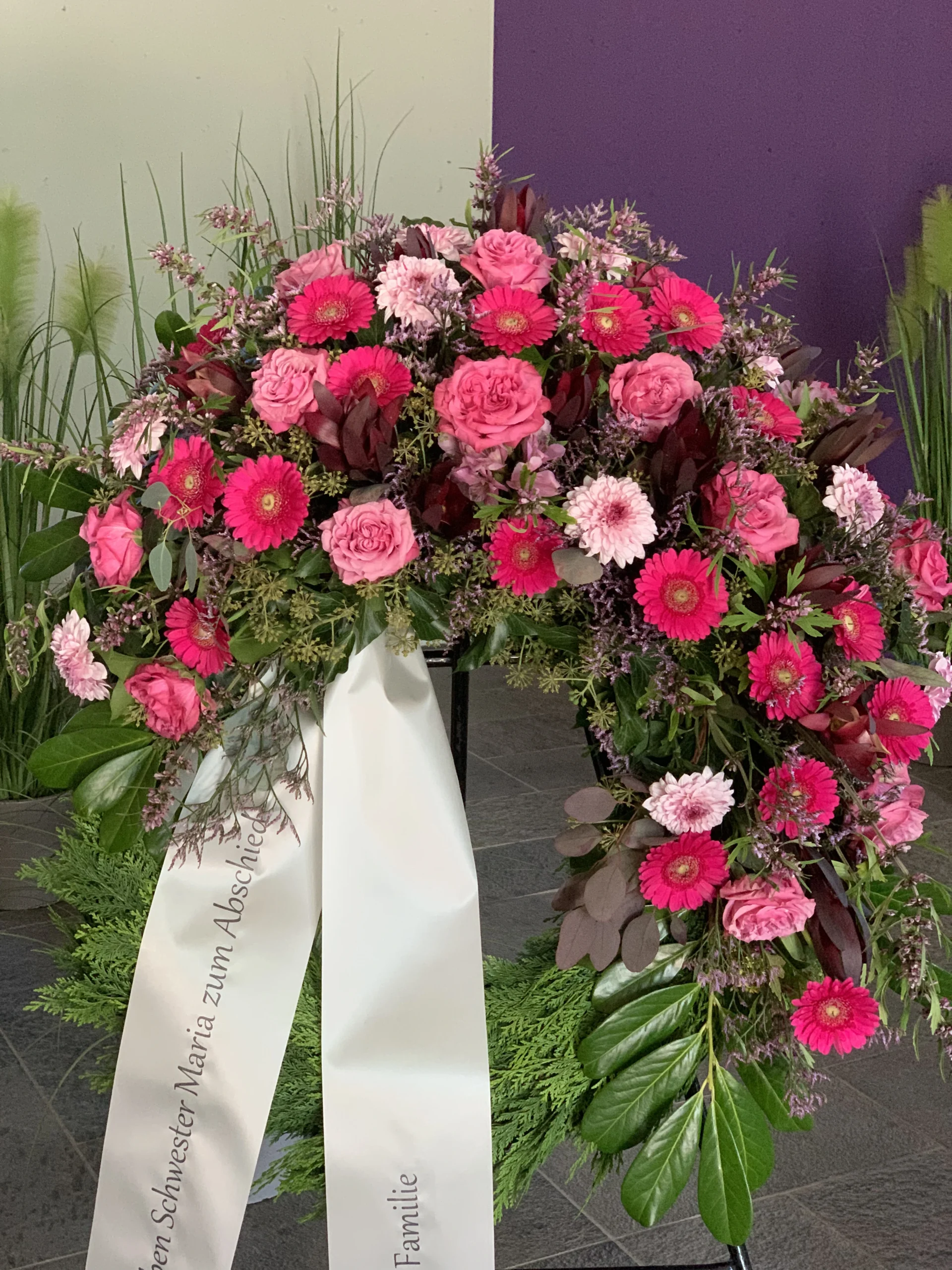 Ja, wir gestalten Trauerkränze nach Ihren Wünschen – mit bestimmten Blumen, Farben und individuellen Schleifenbeschriftungen.
