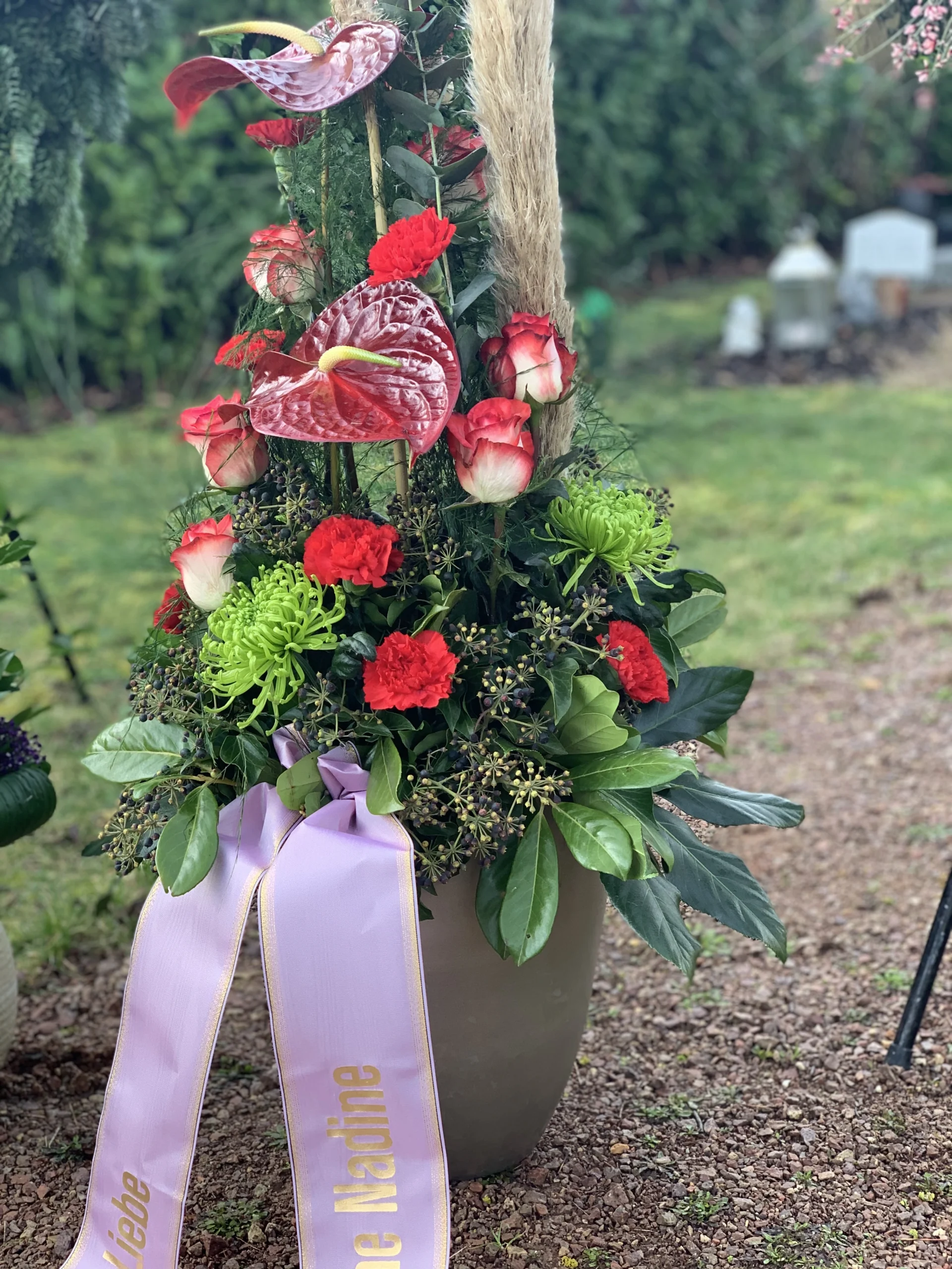 Ob klassische weiße Lilien, symbolische Rosen oder schlichte Blumengestecke – wir gestalten Trauerfloristik mit besonderem Feingefühl und individueller Note.